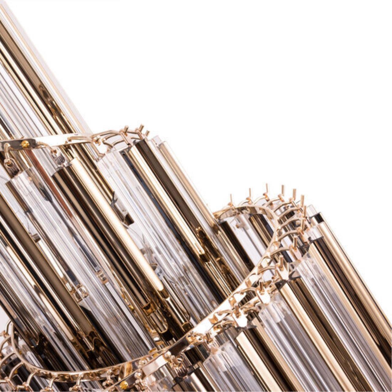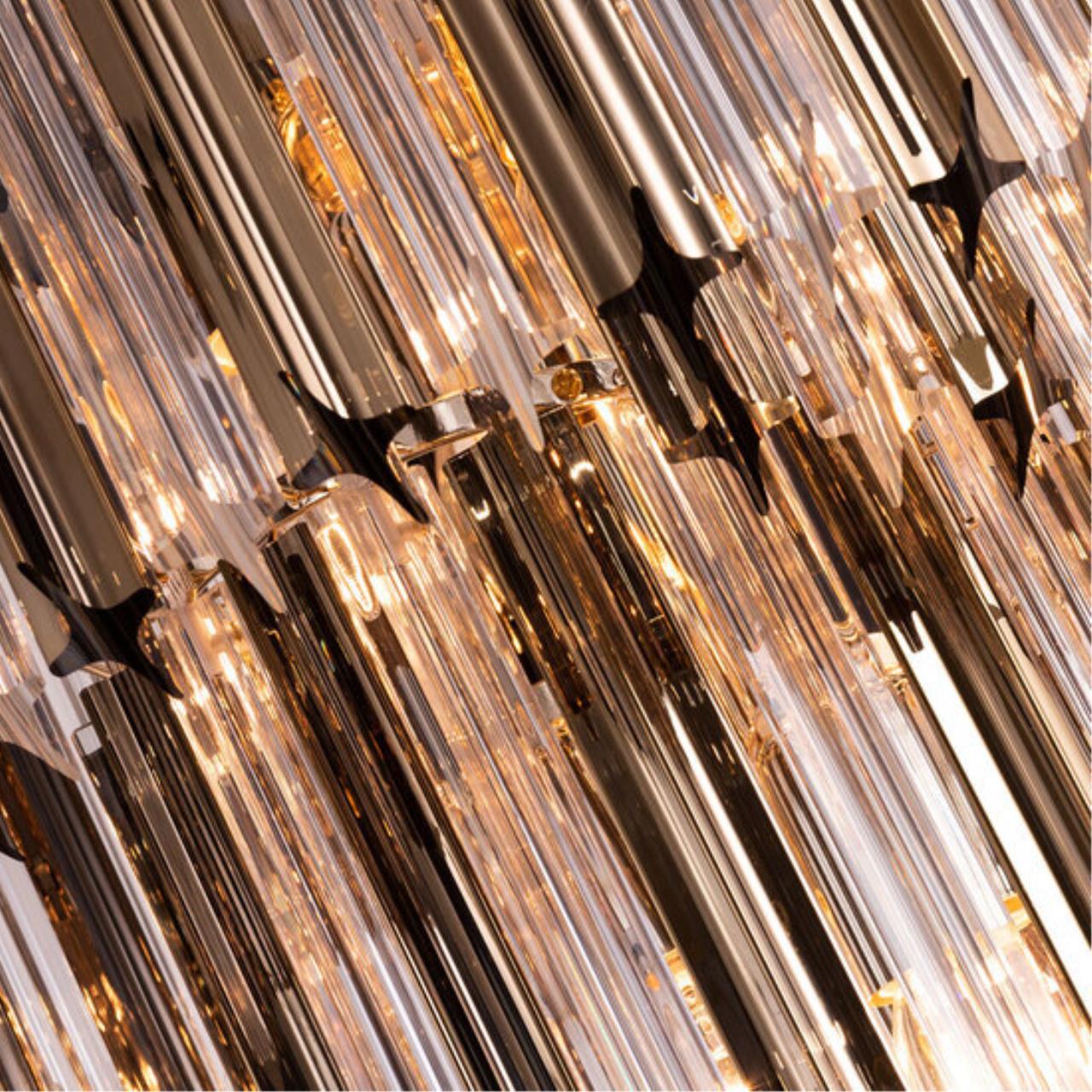 Свободно свисающие хрустальные декоративные элементы, расположенные в несколько рядов, образуют объемную конструкцию, которая при движении воздуха в помещении начинает «звучать». Сочетание золотых и прозрачных декоративных подвесок создают яркий, ослепительный образ модели. В коллекции четыре люстры разных размеров, есть возможность подобрать в помещения разных форматов. Большое бра может быть дополнением в ансамбль с люстрой, а может быть самостоятельным украшением интерьера.