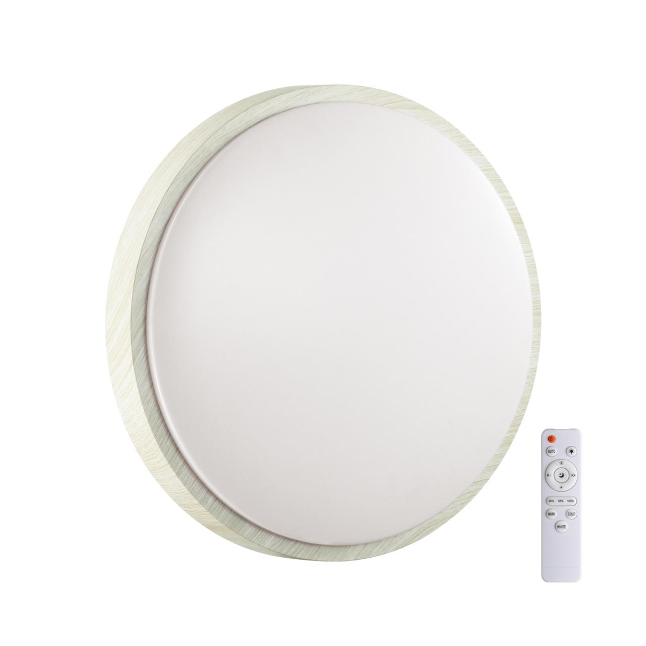 Светильник 7628/EL линии LOSTA состоит из металлического основания (базы) и пластикового рассеивателя. Материал рассеивателя - высококачественный пластик марки PMMA 2.0 белого цвета с матовой поверхностью, обеспечивающий светильнику равномерное рассеивание и хорошее светопропускание. Форма плафона: круглая, декорирована ободом из пластика под беленое дерево. Степень защиты IP43 позволяет использовать светильник в определенных зонах влажных помещений. В комплект входит заменяемый LED модуль с линзами, мощностью 72Вт, которая соответствует лампе накаливания 730Вт. А также пульт ДУ, с помощью которого осуществляется плавное изменение цветовой температуры 3000-4200-6300К, изменение яркости, переход в режим переключения теплого/белого/холодного/ночного света. Светильник имеет функцию "память".