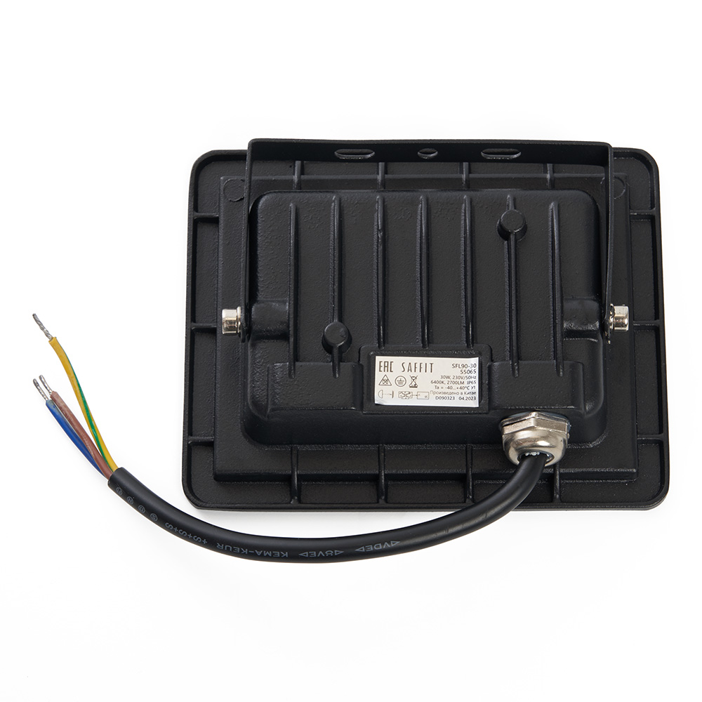 Прожектор светодиодный многоматричный с монтажным креплением на кронштейн, (ДО) SAFFIT SFL90-30, 30W, 6400К (дневной), 230V/50Гц, 2700Lm, IP65, угол рассеивания 120°,*SMD2835, раб.t -40°C - +40°C, цвет чёрный, корпус алюминий литой под давлением + стекло, 117*92*27,5 мм