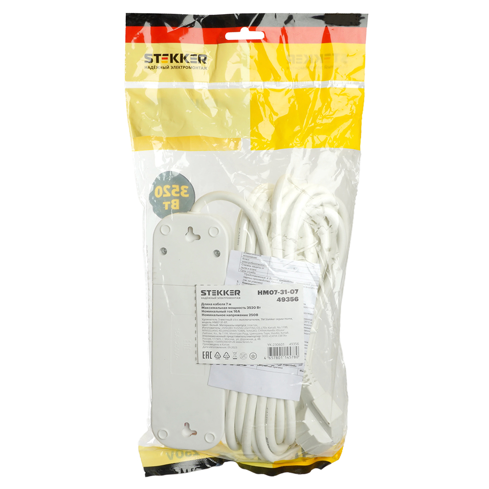 Удлинители STEKKER 49356, серия Home, цвет белый, длина 7 м, количество розеток 3, сталь, сечение кабеля 1 мм2, тип кабеля ПВС, материал кабеля -, ток 16А, напряжение 250В, максимальная нагрузка 3520Вт, тип вилки - прямая. Диапазон рабочих температур  +1..+35°C, степень защиты IP20, класс защиты от поражения эл. током 1, размеры изделия -*-*-. Гарантия 1 год.