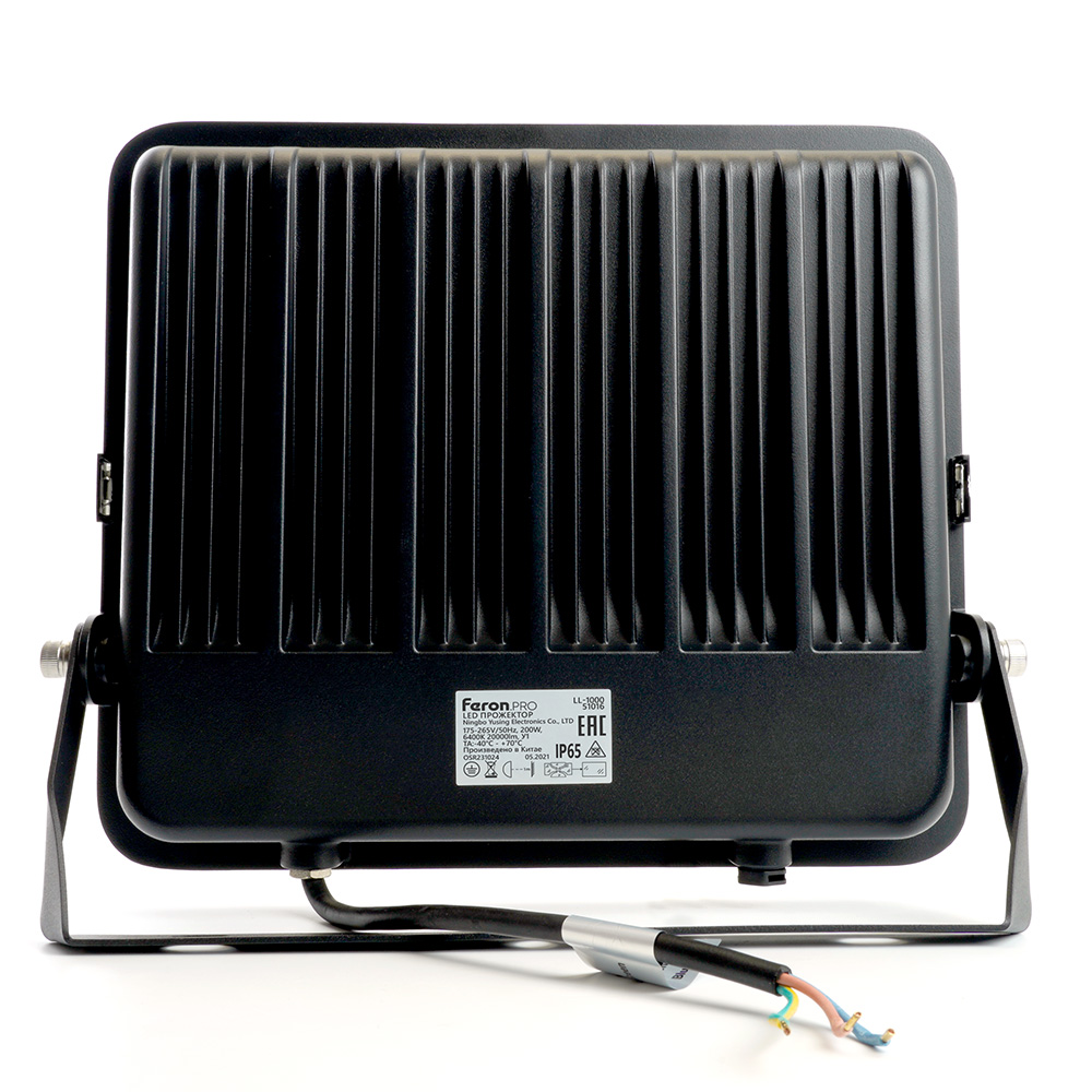 Прожектор светодиодный многоматричный с монтажным креплением на кронштейн, (ДО) FERON LL-1000 , 200W, 6400К (холодный белый), 175-265V/50Гц, 24000Lm, IP65, угол рассеивания 120°, 288*OSRAM, раб.t -40°C - +70°C, цвет чёрный, корпус алюминий литой под давлением + стекло, 402,5*349,5*44 мм