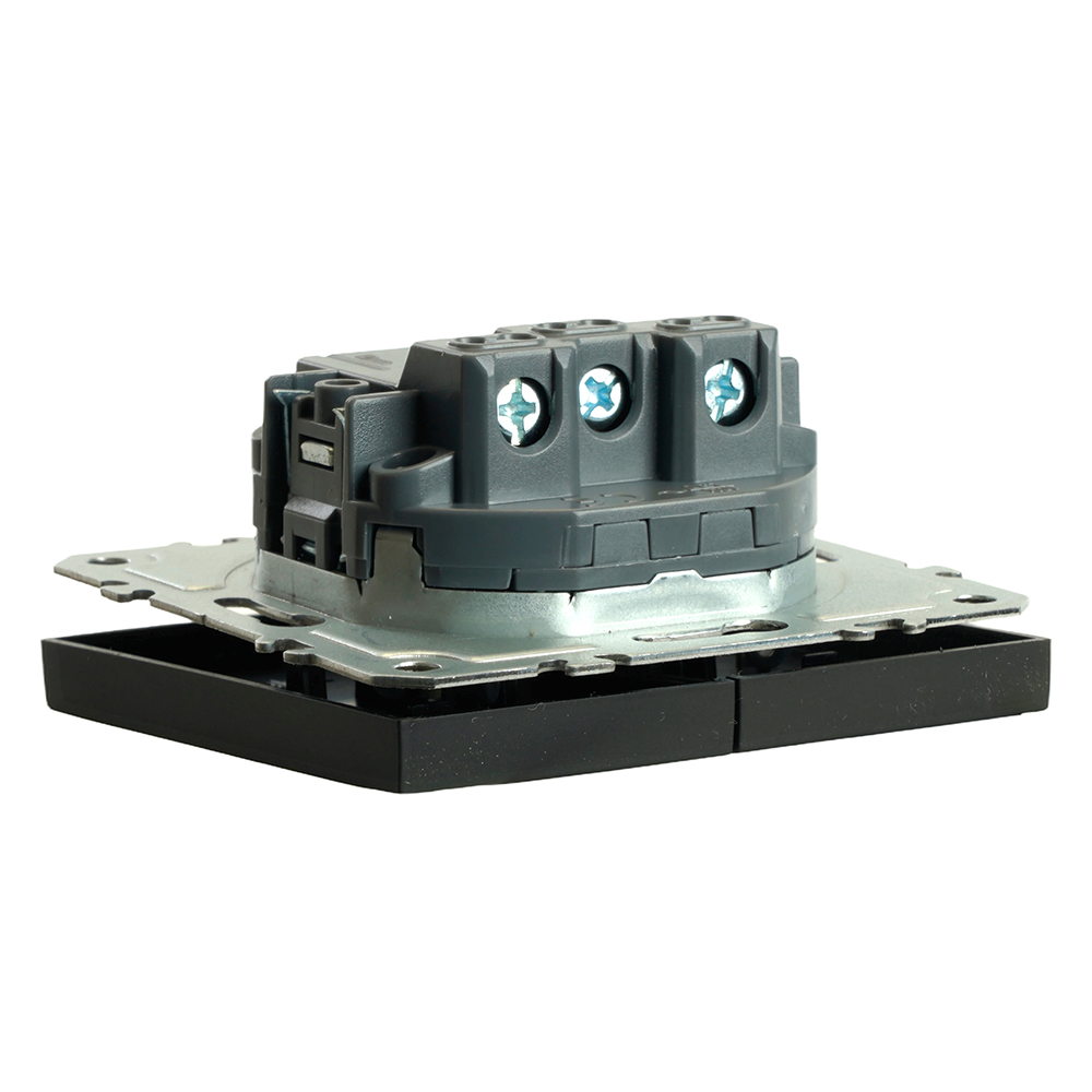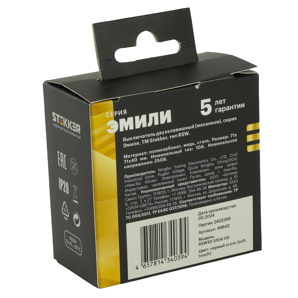 Выключатели двухклавишный STEKKER RSW10-5104-05, серия Эмили тип установки - скрытый, размер изделия 71*71*40мм., цвет черный уголь, soft touch, материал изделия поликарбонат, латунь, сталь. Номинальное напряжение 250 , номинальный ток 10А, 20