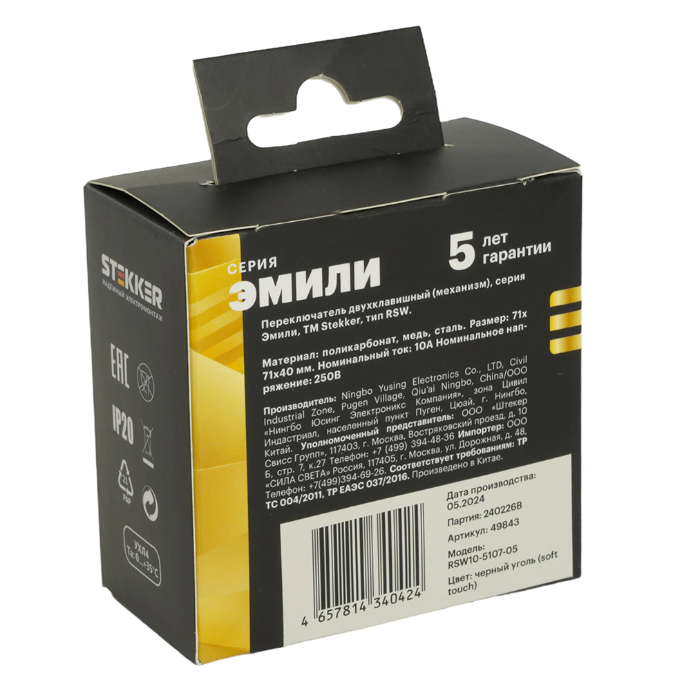 Выключатели двухклавишный STEKKER RSW10-5107-05, серия Эмили тип установки - скрытый, размер изделия 71*71*40мм., цвет черный уголь, soft touch, материал изделия поликарбонат, латунь, сталь. Номинальное напряжение 250 , номинальный ток 10А, 20
