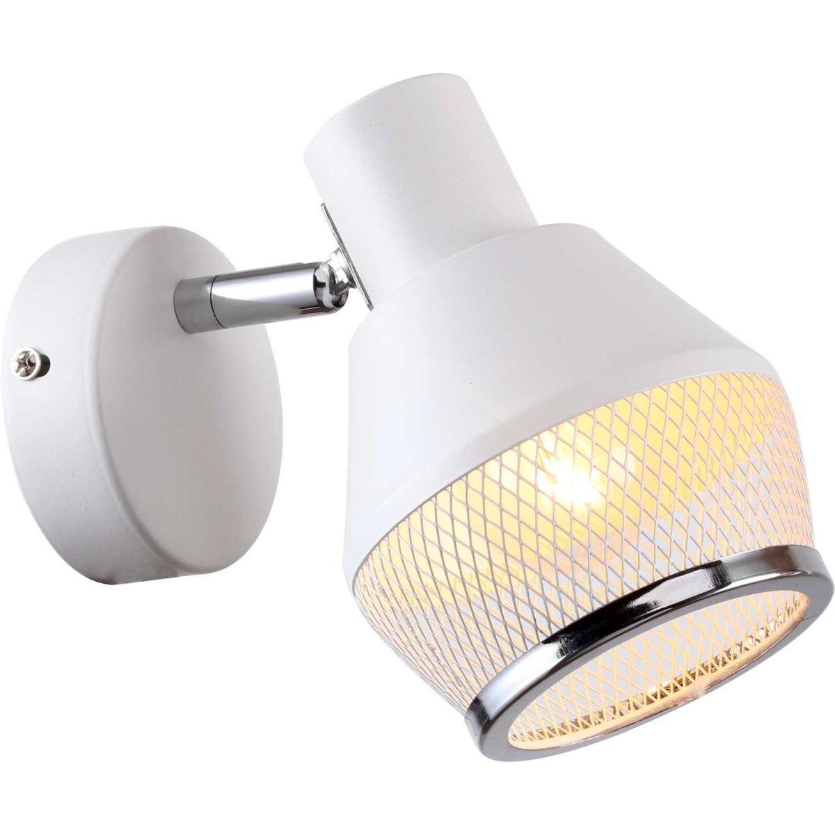 Спот настенный из коллекции Vekta / Векта выполнен из металла, окрашенного в белый цвет. Держатель плафона гальванизирован в цвет хрома. Металлический плафон спота декорирован сеткой, окрашенной в белый цвет, и кантом, гальванизированным в цвет хрома. Плафон имеет поворотный механизм.