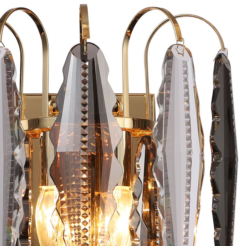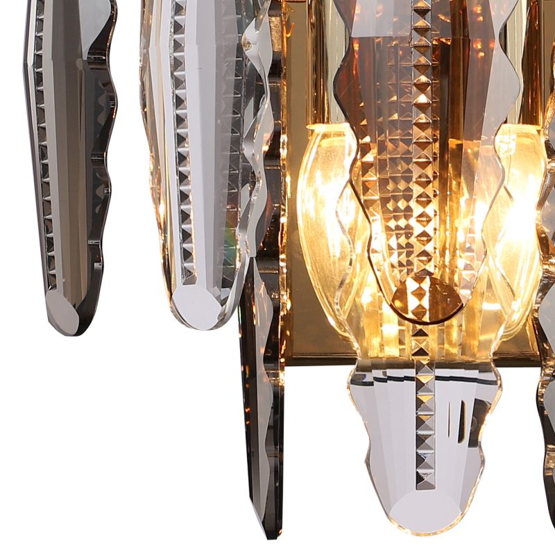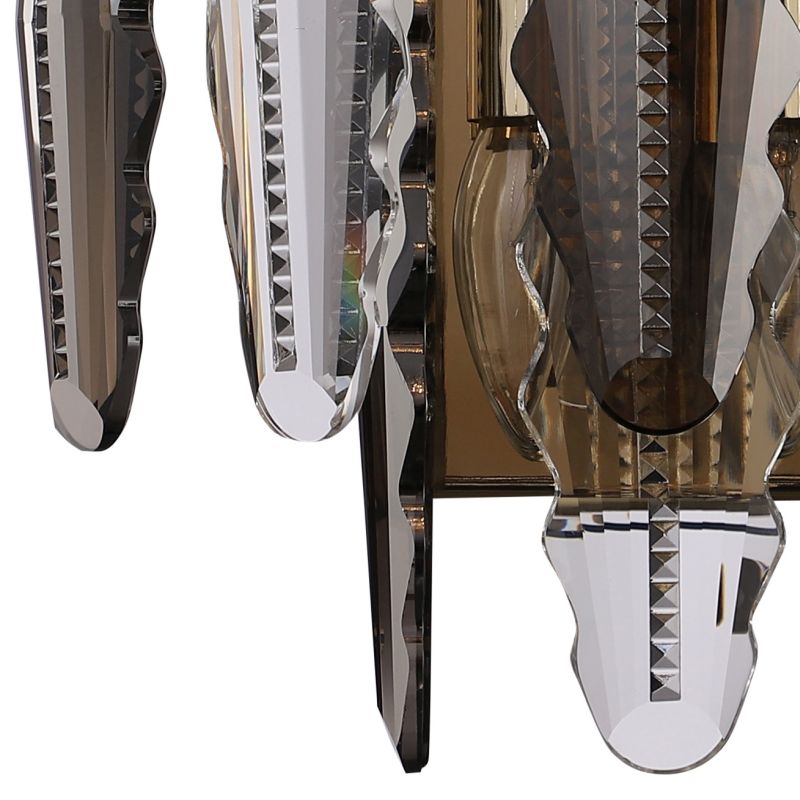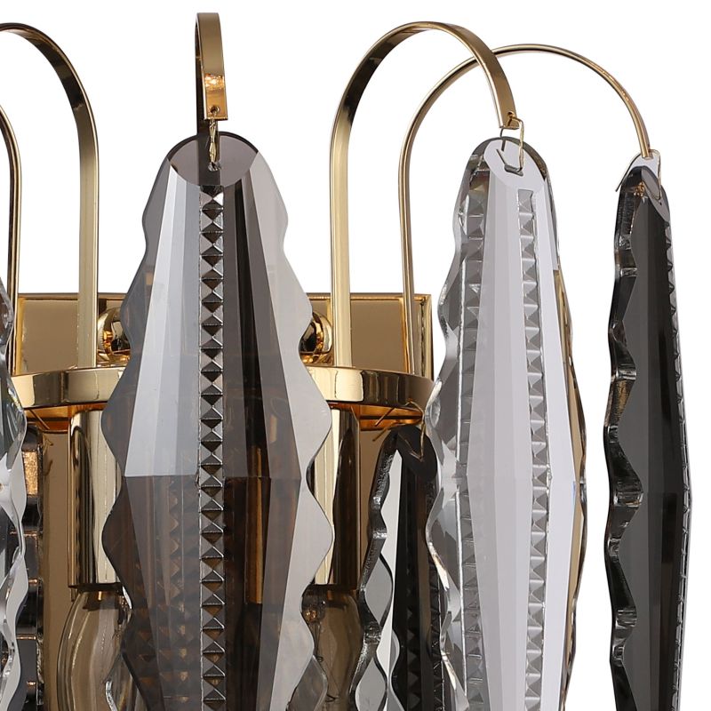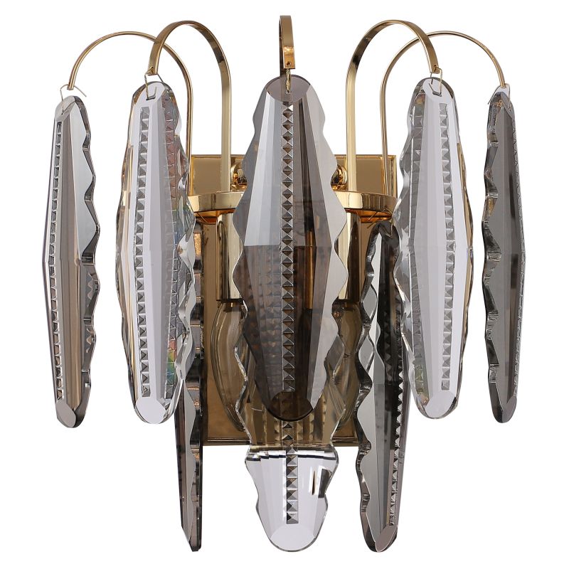Светильник настенный из коллекции Florin / Флорин выполнен из металла, гальванизированного в цвет золота, и декорирован прозрачным и дымчатым хрусталем вытянутой формы высшей категории.