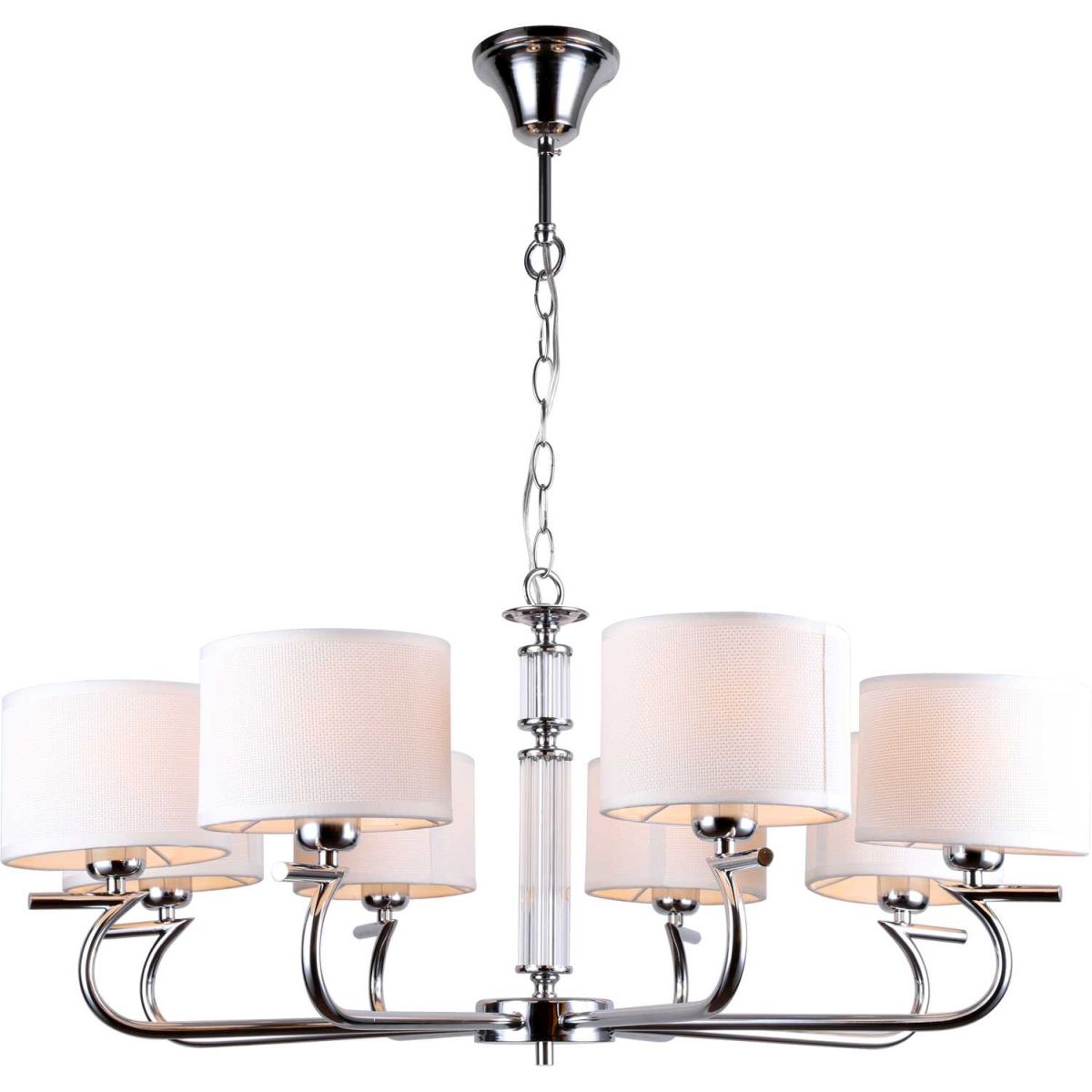 Люстра подвесная из коллекции Ellada / Эллада выполнена из металла, гальванизированного в цвет хрома, и декорирована текстильными цилиндрическими абажурами кремового цвета с термостойким акрилом внутри и прозрачным стеклом линейной структуры на центральной оси.