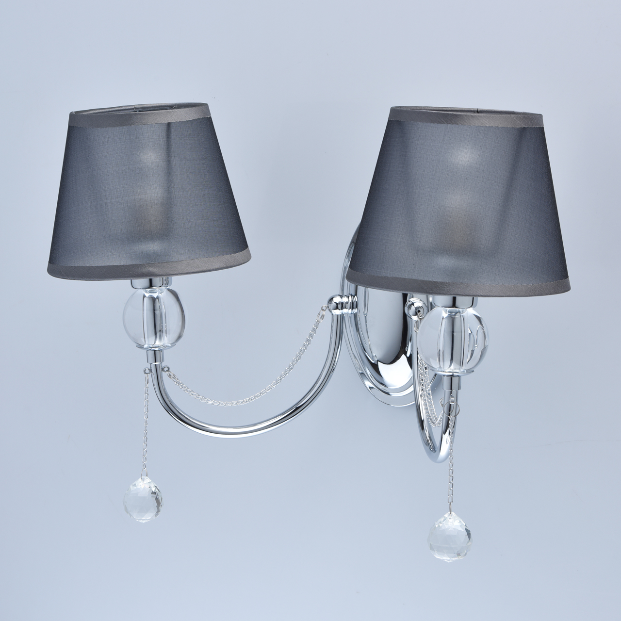 Основание светильника выполнено из металла и гальванизировано в цвет хрома. Рожки выполнены по технологии проката на роликовом станке. Розетки выполнены из прозрачного акрила  в виде  шара.                                                                  Двойные плафоны: выполнены из органзы графитового цвета, с атласным кантом серого цвета и с термостойким акрилом с внутренней стороны, прошиты.Декор: цепочки гальванизированы в цвет арматуры, подвески декорированы прозрачными хрустальными шарами.